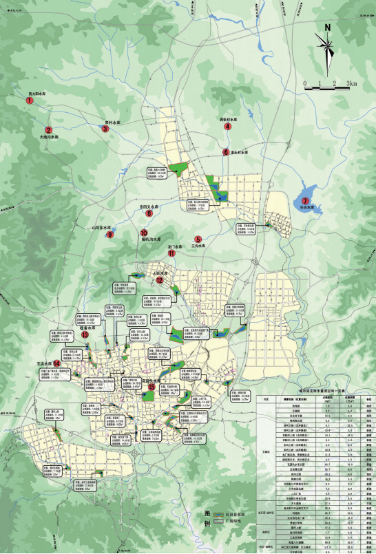 規(guī)劃通過控制地表徑流、內(nèi)河治理與行泄通道建設(shè)、完善雨水管網(wǎng)系統(tǒng)、建設(shè)雨水蓄滯空間及局部地段豎向調(diào)整等措施,提高城市排水防澇能力;改善城市下墊面組成,提高雨水入滲率,降低城市綜合徑流系數(shù),從源頭上削減城市雨水徑流量;對(duì)城市內(nèi)河進(jìn)行綜合治理,對(duì)主要行泄通道進(jìn)行控制、改造,形成城市排水網(wǎng)絡(luò)的主通道;提高城市排水管網(wǎng)的建設(shè)標(biāo)準(zhǔn),一般地區(qū)管網(wǎng)重現(xiàn)期采用 2 年一遇,重要地段采用 3 ~ 5年一遇,內(nèi)澇高風(fēng)險(xiǎn)區(qū)域管網(wǎng)采用 5 年一遇;在局部低洼地段規(guī)劃設(shè)置 6 座雨水泵站,設(shè)置 31 處雨水蓄滯空間。