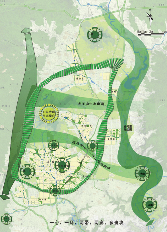 規(guī)劃突破傳統(tǒng)綠規(guī)編制范圍局限于規(guī)劃城市建成區(qū),采用擴(kuò)大的區(qū)域生態(tài)觀,從市域、市域外圍發(fā)展地區(qū)、中心地區(qū)三個(gè)層次進(jìn)行綠地系統(tǒng)的規(guī)劃控制。規(guī)劃確定了“一主四副” 的區(qū)域生態(tài)重建圈,“東西兩縱”的市域生態(tài)廊道,縱橫交錯(cuò)的綠化隔離帶與資源豐富的生態(tài)資源保護(hù)區(qū)相輔相成的區(qū)域生態(tài)框架。按照山水相依、城林交融、環(huán)圈圍繞、點(diǎn)面結(jié)合、大小配置、綠廊聯(lián)系的原則,構(gòu)建了“一環(huán)、一心、三山、四河、八軸、多節(jié)點(diǎn)”的空間結(jié)構(gòu),形成生態(tài)基質(zhì) + 綠色廊道 + 綠地斑塊的復(fù)合生態(tài)綠地系統(tǒng)格局。